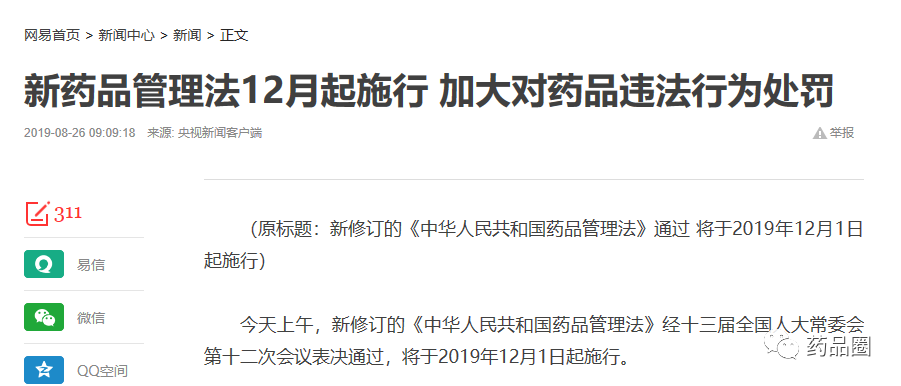 2019年8月26日,新修订的《中华人民共和国药品管理法》经十三届全国人大常委会第十二次会议表决通过, 将于2019年12月1日起施行 。