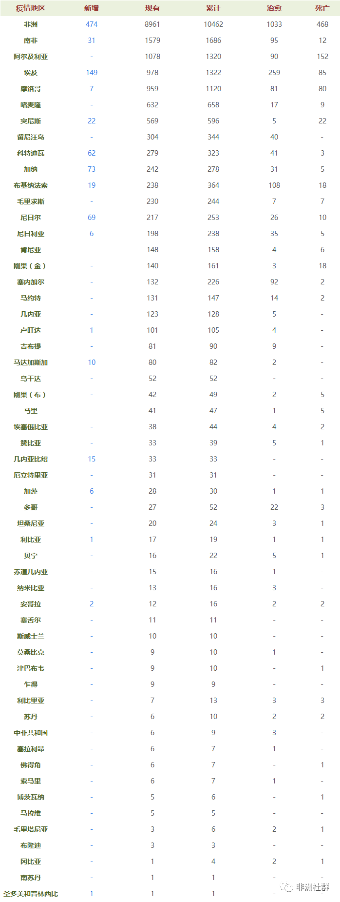 目前,非洲新冠肺炎确诊累计10462例,现有8961例,新增474例,治愈1033例,死亡468例。