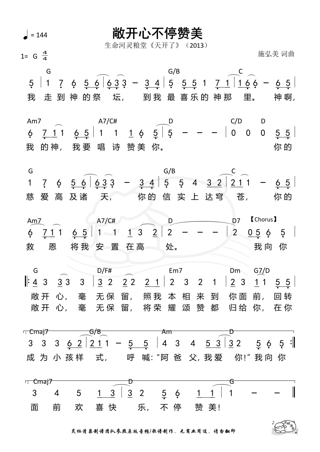+- 首页 生命河灵粮堂 正文 音频播放地址: 视频播放地址: 敞开心 不停赞美 Endless Praise 词曲:施弘美 Tiffany Wang 我走到神的祭坛 到我最喜乐的神那裡 神啊 我的神 我要唱诗赞美你 你的慈爱高及诸天 你的信实上达穹苍 你的救恩 将我安置在高处 我向你敞开心 毫无保留 照我本相来到你面前 回转成为小孩样式 呼喊 阿爸父 我爱你 我向你敞开心 毫无保留 将荣耀颂赞都归给你 在你面前欢喜快乐 不停赞美 歌谱: 赞美诗歌未整理以斯拉盛晓玫祝瑞莲生命河灵粮堂小羊诗歌Jesus Image天韵合唱团新酒使命团我心旋律JLSS BlessedThe Hope佳音 收藏 分享 链接