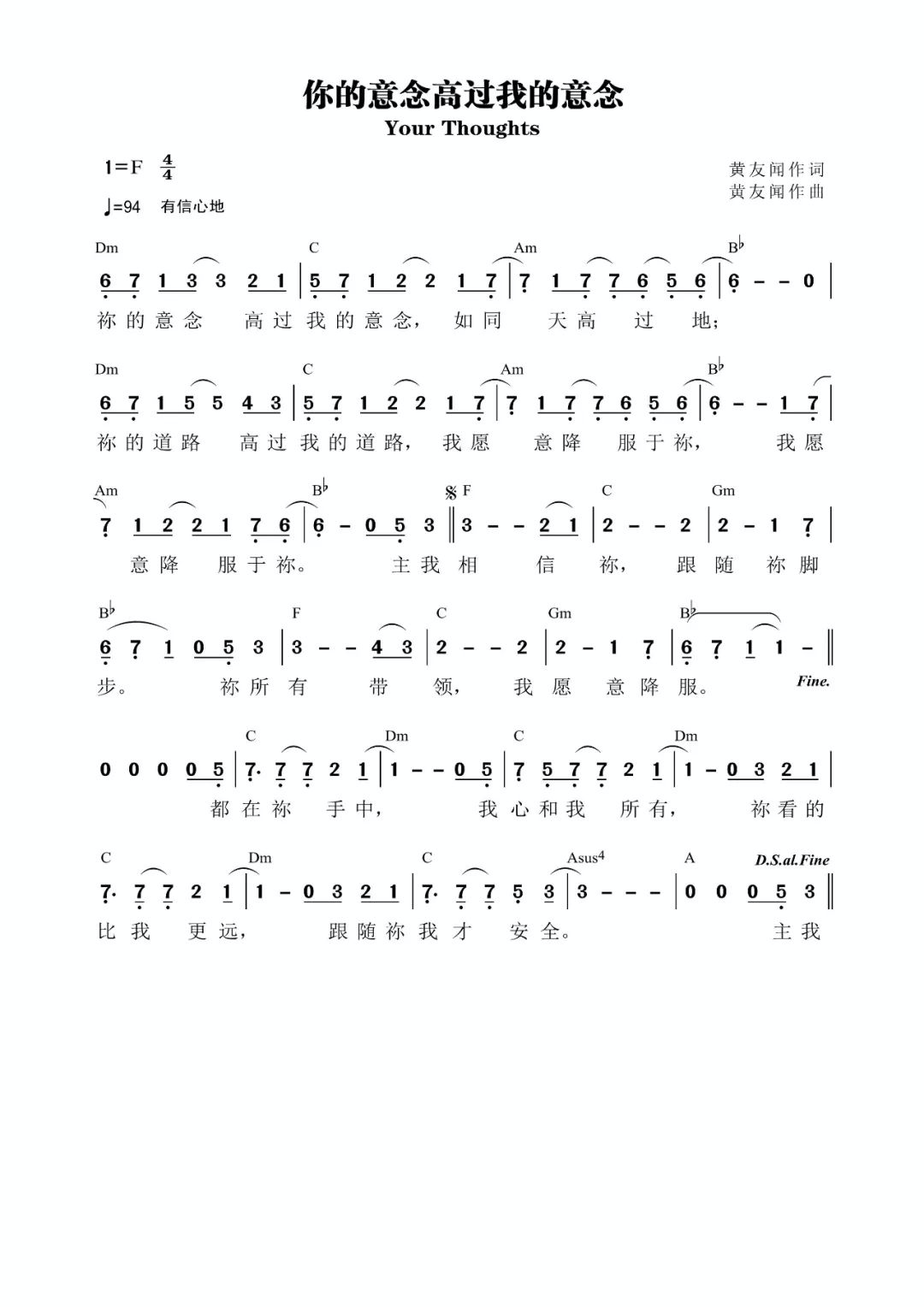 +- 首页 黄友闻 正文 音频播放地址: 视频播放地址: 你的意念高过我的意念 如同天高过地 你的道路高过我的道路 我愿意降服于你 我愿意降服于你 主我相信你 跟随你脚步 你所有带领 我愿意降服 都在你手中 我心和我所有 你看的比我更远 跟随你我才安全 歌谱: 黄友闻FRCC幕主音乐 赞美之门 收藏 分享 链接