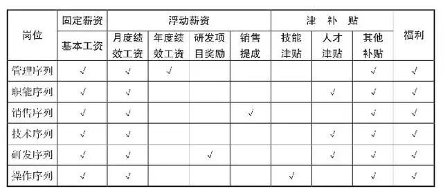 管理序列浮动(激励)薪资占比较高,一些企业的管理序列实行年薪制;操作序列固定薪资占比较高,除基本工资外,大多会实行计件工资制;技术序列除基本工资外,一些企业还会设置项目奖金、技能/技术津贴,以固定薪资为主;销售序列常常采用佣金(提成)制,或以绩效工资为主,基本工资占比较低;职能序列基本工资占比较高。