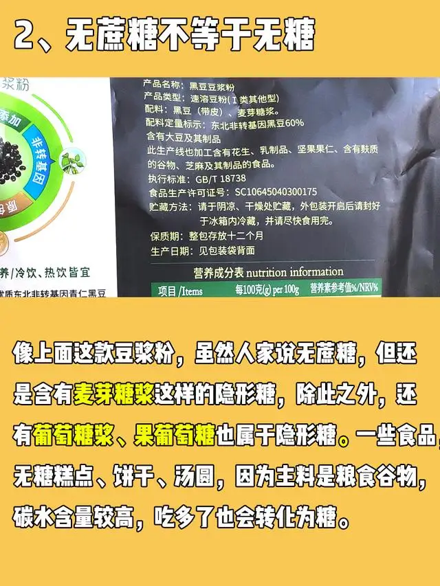 3⃣️ 没有蔗糖不等于无糖。人家说无蔗糖,只是没有直接添加糖,至于原料中有没有其它的糖、有多少,就另当别论了。