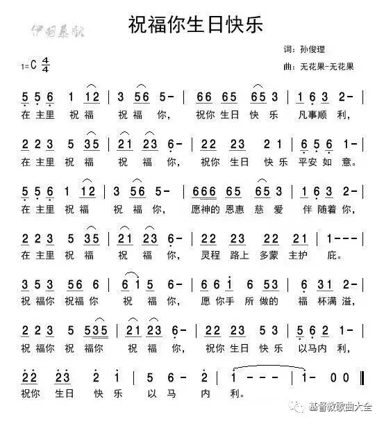 《祝福你生日快乐》 作词:孙俊理 作曲:伊甸慕歌 编曲:完美音乐 演唱:柯 南 在主里祝福祝福你 祝你生日快乐凡事顺利 在主里祝福你祝福你 祝你生日快乐平安如意 在主里祝福祝福你 愿神的恩惠慈爱伴随着你 在主里祝福祝福你 灵程路上多蒙主护庇 祝福你祝福你祝福你 愿你手所做的福杯满溢 祝福你祝福你祝福你 祝你生日快乐以马内利 music…… 在主里祝福祝福你 祝你生日快乐凡事顺利 在主里祝福你祝福你 祝你生日快乐平安如意 在主里祝福祝福你 愿神的恩惠慈爱伴随着你 在主里祝福祝福你 灵程路上多蒙主护庇 祝福你祝福你祝福你 愿你手所做的福杯满溢 祝福你祝福你祝福你 祝你生日快乐以马内利 祝福你祝福你祝福你 愿你手所做的福杯满溢 祝福你祝福你祝福你 祝你生日快乐以马内利 祝你生日快乐以马内利