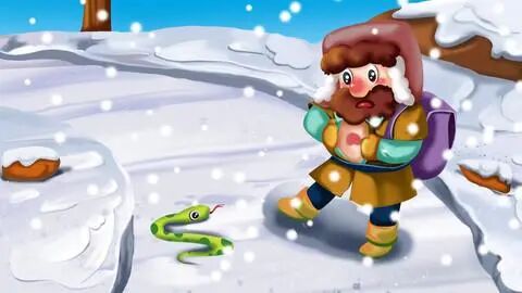 It is a cold day in winter. A farmer finds a snake on the ground. It is nearly dead with cold.这是冬天寒冷的一天。一个农民在地上发现了一条蛇。这条蛇快被冻死了。