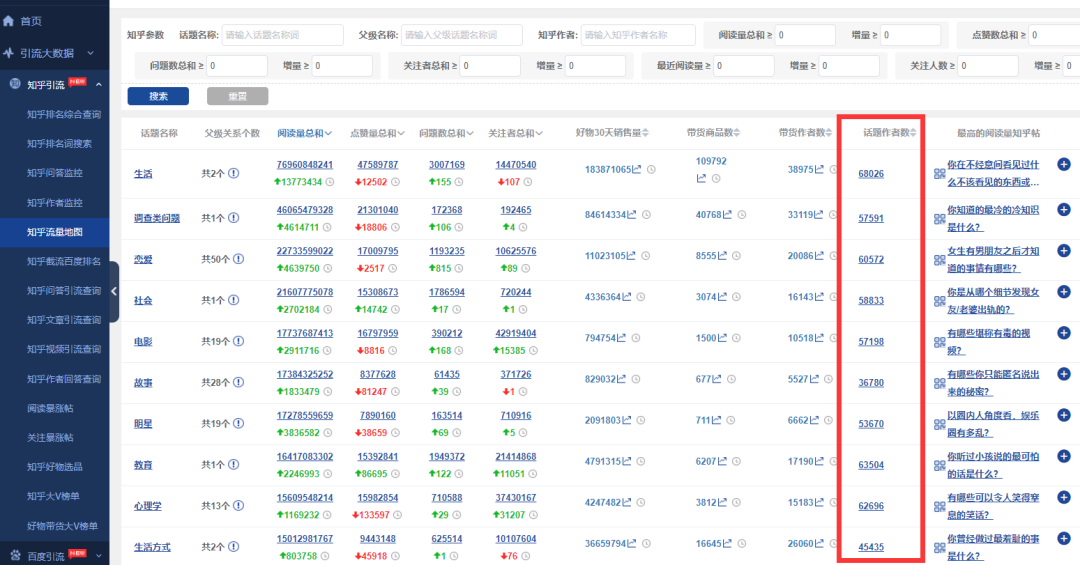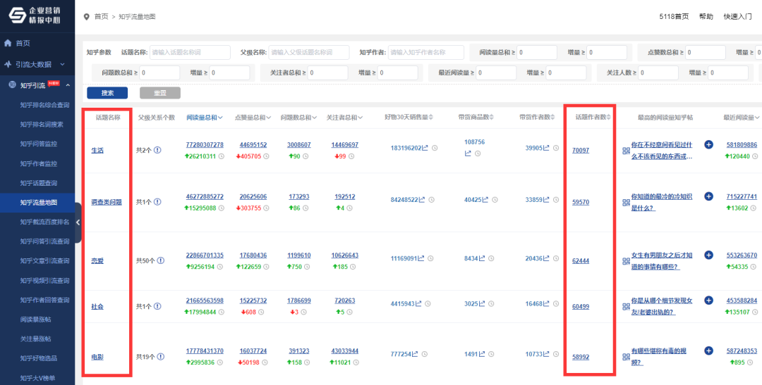在5118「知乎流量地图」筛选项及参数列中,新增了“话题作者数”,用于区别该话题下的作者权重。