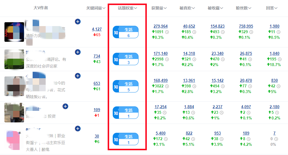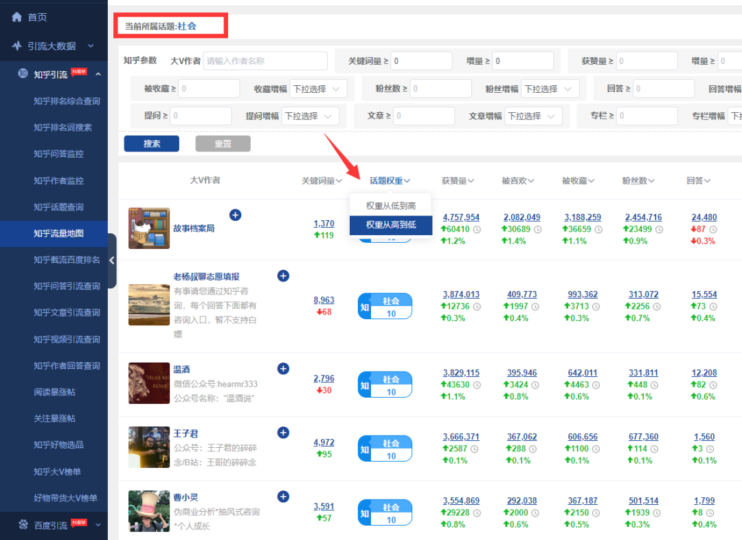 1、根据参与话题筛选,数据列将显示作者在话题下的权重,用作找出某领域内最强作者。