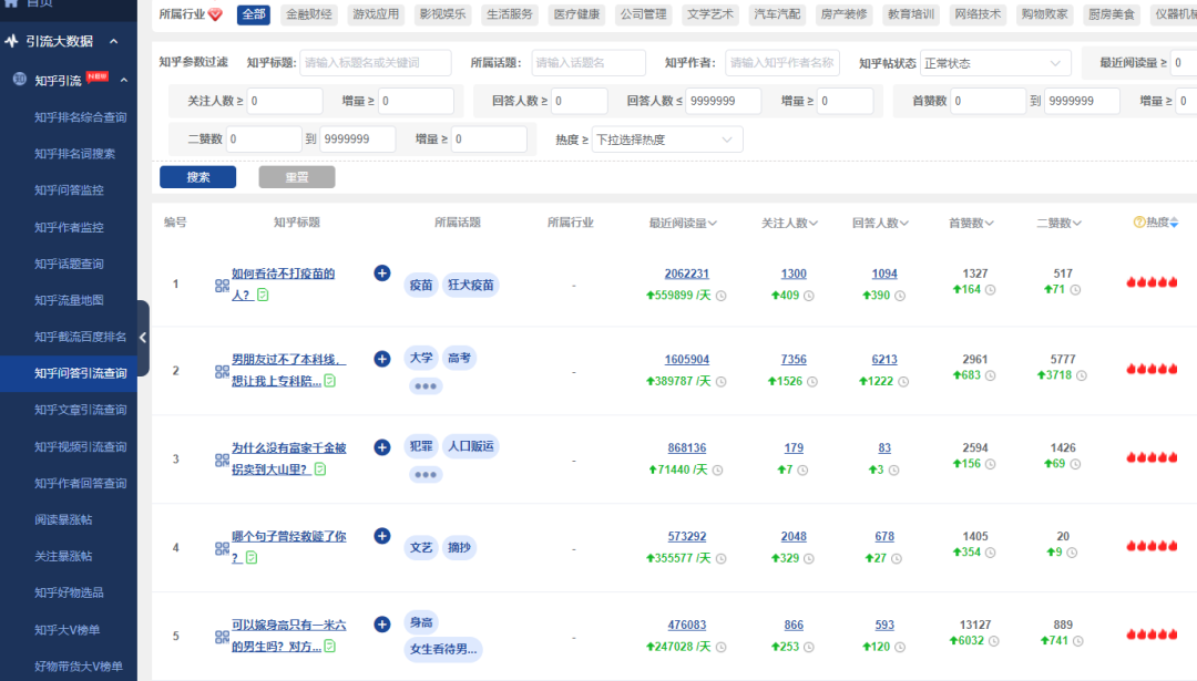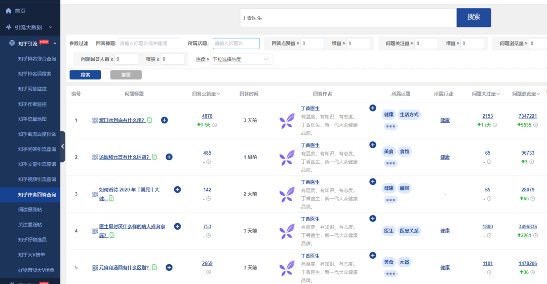 通过工具找出流量巨大的主流搜索引擎中,知乎的排名数据,借助大数据的筛选过滤,挖掘出关注量大,但回答量少的蓝海问题。