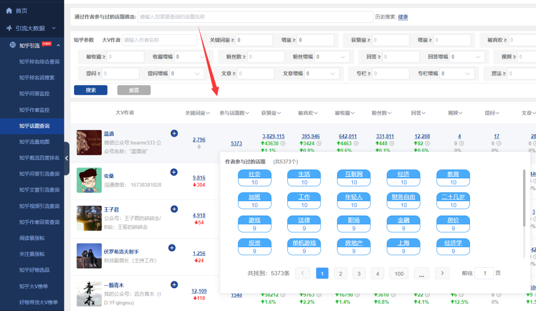 2、如不做话题筛选,数据列将显示作者参与过的所有话题,用作查看某个作者参与的所有话题中最强话题。