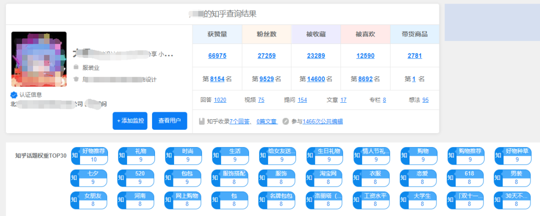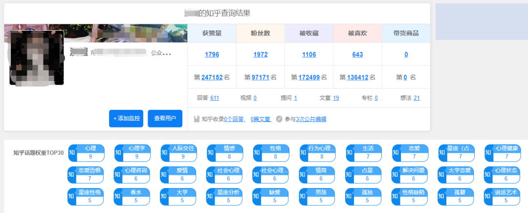 在5118「知乎排名综合查询」分析页作者信息下,集成了该作者擅长的30个话题权重,便于用户快速了解该作者擅长的领域及权重。