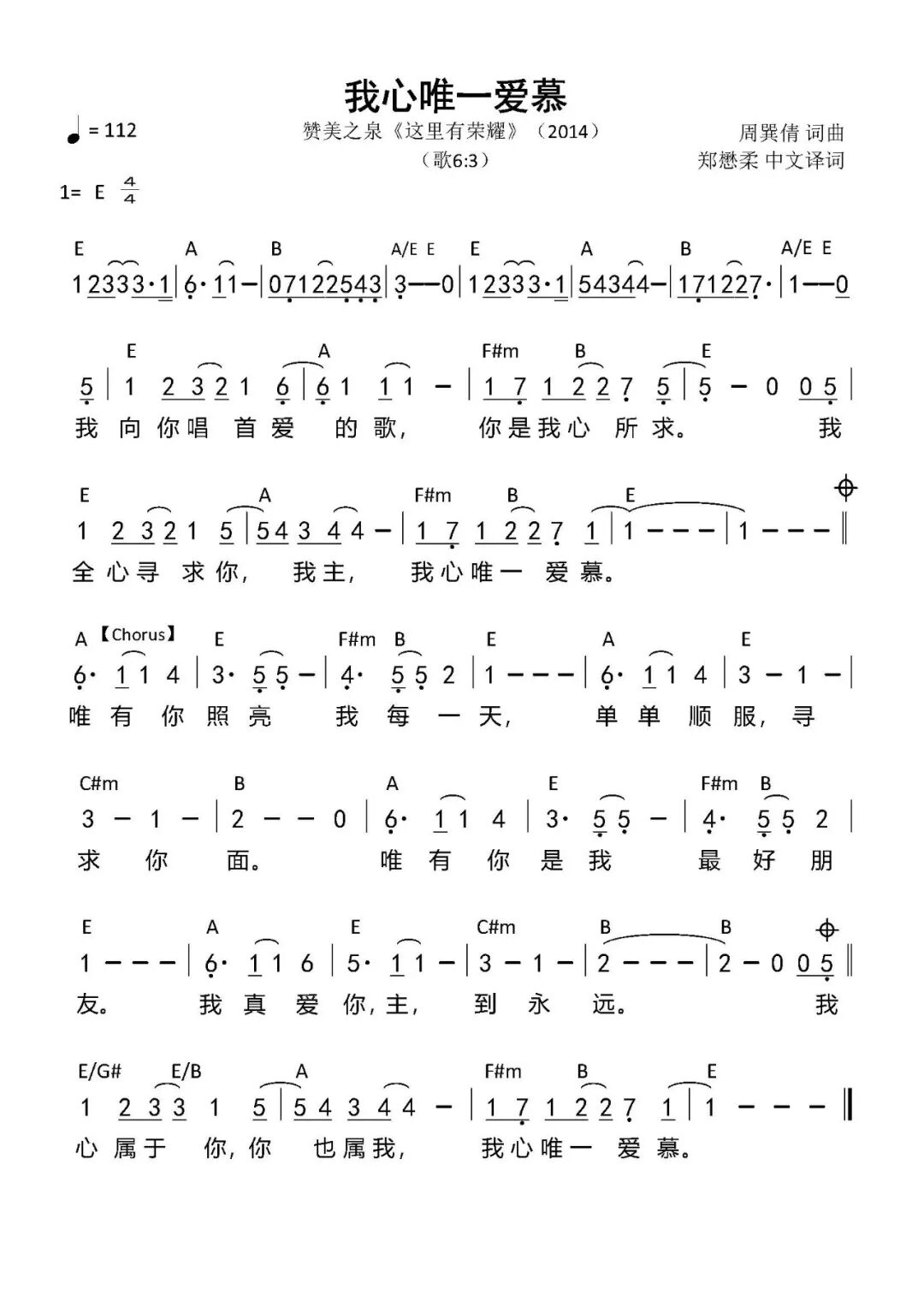我心唯一爱慕 You Are the One I Want 词,曲: 周巽倩 Mary Chikagami Lee 中文译词:郑懋柔 Tiffany M. Cheng © 2014 Stream of Praise Music/BMI. CCLI: 7025185 [Verse 1] 我向祢唱首爱的歌 祢是我心所求 我全心寻求祢我主 我心唯一爱慕 [Chorus] 唯有祢照亮我每一天 单单顺服寻求祢面 唯有祢是我最好朋友 我真爱祢主到永远 [Coda] 我心属于祢 祢也属我 我心唯一爱慕 卡拉OK版MV製作 Karaoke MV made by:蔡婷婷 Christine Cai