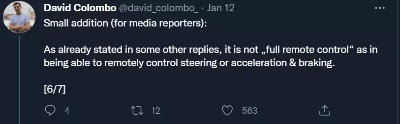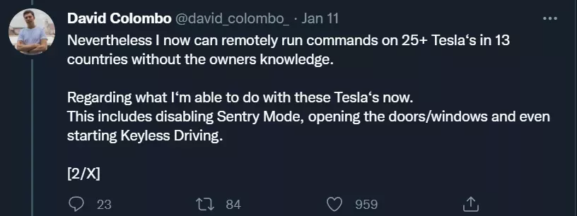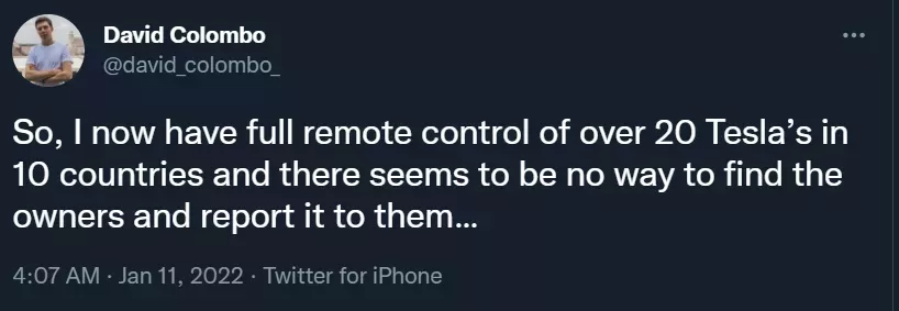 在 1 月 11 日发布的推特上,Colombo 表示,他已经可以向13个国家的至少25辆汽车上推送指令。后续的分析表明,这一数字可以扩大到数百辆。