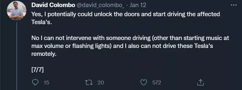 Colombo 表示,在披露自己的发现之前,他联系到了德国、美国和爱尔兰的三位特斯拉车主。他在 Twitter 上展示了一段私人对话的截图,其中一位受影响的车主允许他远程按汽车喇叭,以确认漏洞的存在。