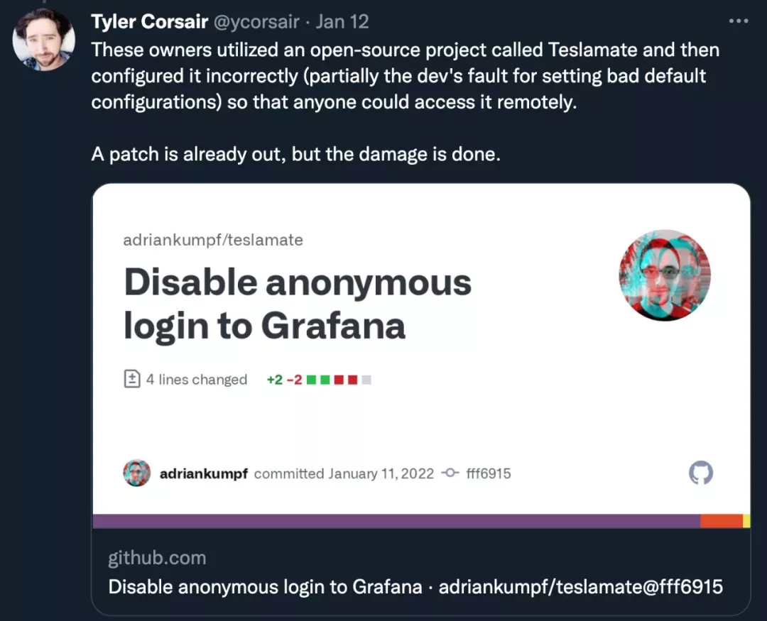 Teslascope 创始人 Tyler Corsair 也在推特上澄清道:「Colombo 提到的那些用户使用了一个名为 Teslamate 的开源项目,然后错误地对其进行了配置(部分原因是开发人员设置了错误的默认配置),因此任何人都可以远程访问它。」在接到报告之后,他们已经推出了补丁。