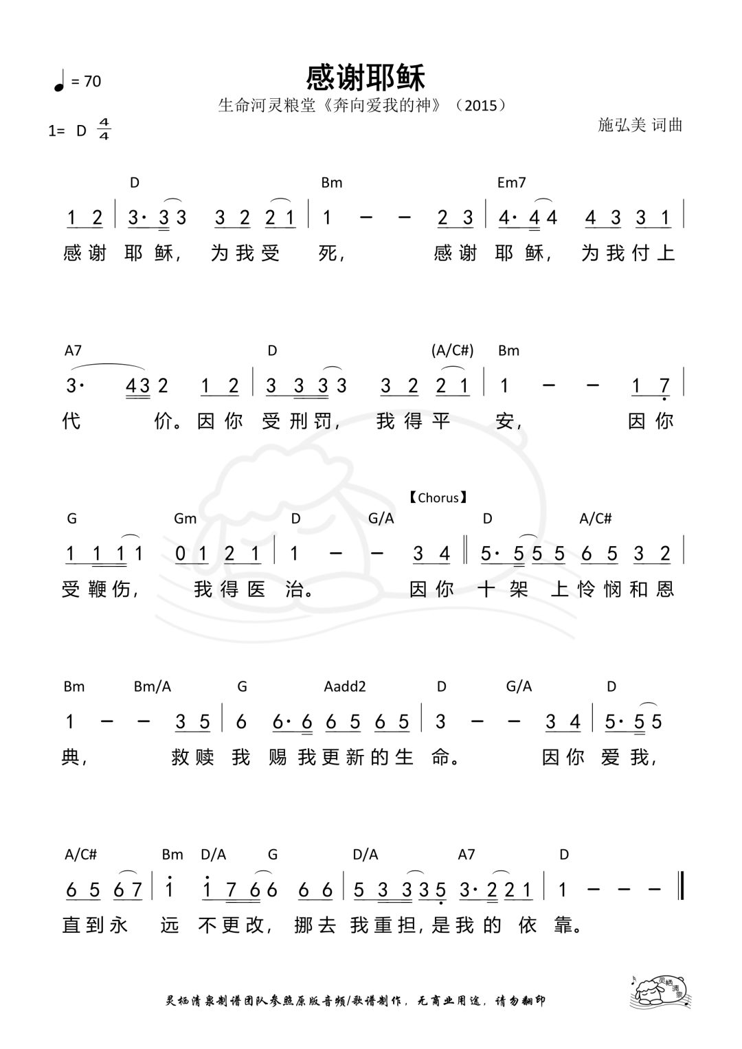 +- 首页 生命河灵粮堂 正文 音频播放地址: 视频播放地址: Youtube播放地址: 感谢耶稣 Thank You, Jesus 词曲:施弘美 Tiffany Wang 感谢耶稣 为我受死 感谢耶稣 为我付上代价 因你受刑罚 我得平安 因你受鞭伤 我得医治 因你十架上怜悯和恩典 救赎我 赐我更新的生命 因你爱我 直到永远不更改 挪去我重担 是我的依靠 ©️ 歌谱: 赞美诗歌未整理以斯拉盛晓玫祝瑞莲生命河灵粮堂小羊诗歌Jesus Image天韵合唱团新酒使命团我心旋律JLSS BlessedThe Hope佳音 赞美之门 收藏 分享 链接