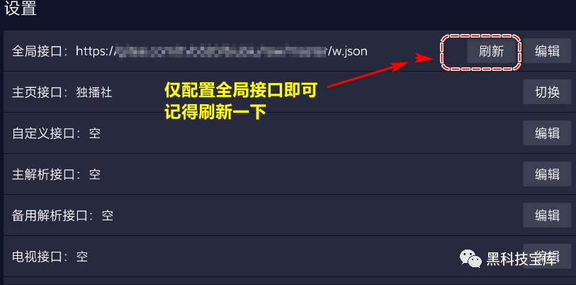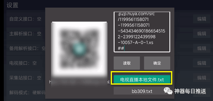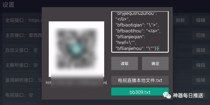 3、然后,回到 「BiuBiuTV317终极版」的设置页面的全局接口编辑页面,点击一下读取,你会看到下面自动出现刚才存放的接口文件名称。