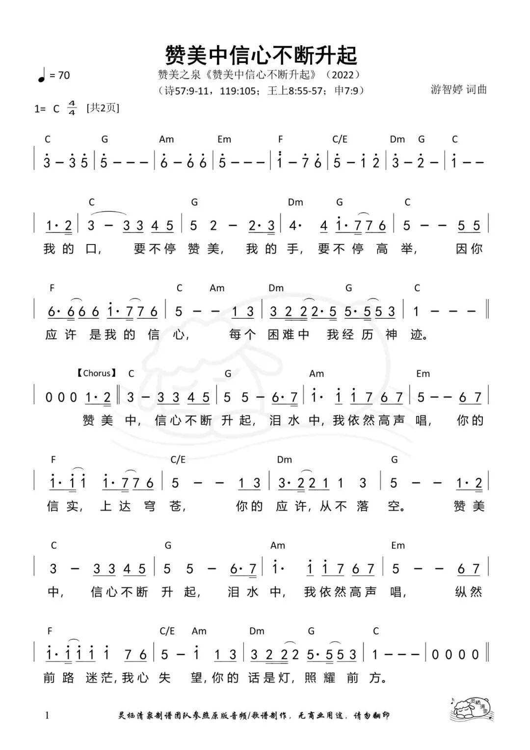 赞美中信心不断升起 Let Faith Arise In Our Praises 词、曲:游智婷 Sandy Yu [Verse] 我的口要不停ZM 我的手要不停高举 因你应许是我的信心 每个困难中我经历神迹 [Chorus] ZM中信心不断升起 泪水中我依然高声唱 你的信实上达穹苍 你的应许从不落空 ZM中信心不断升起 泪水中我依然高声唱 纵然前路迷茫我心失望 你的话是灯照耀前方 你信实何广大你信实何广大 每早晨赐下新丰盛恩惠 我一切需要你手丰富预备 你信实何广大显在我身 [Coda] Aman Aman Aman Aman