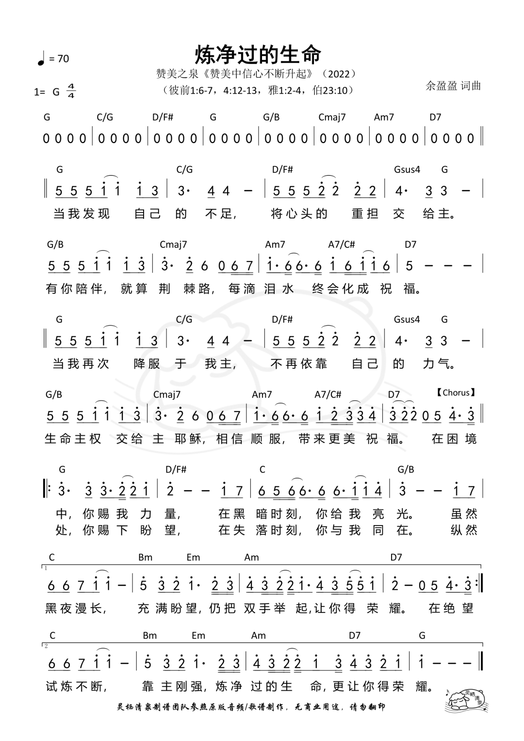 炼淨过的生命 A Purified Life 词、曲:余盈盈 Sarah Yu © 2022 Stream of Praise Music / BMI. CCLI 7197685 中文: [Verse] 当我发现自己的不足 将心头的重担交给主 有你陪伴 就算荆棘路 每滴泪水 终会化成祝福 当我再次降服于我主 不再倚靠自己的力气 生命主权 交给主耶稣 相信顺服带来更美祝福 [Chorus] 在困境中 你赐我力量 在黑暗时刻 你给我亮光 虽然黑夜漫长 充满盼望 仍把双手举起 让你得荣耀 在绝望处 你赐下盼望 在失落时刻 你与我同在 纵然试炼不断 靠主刚强 炼淨过的生命 更让你得荣耀