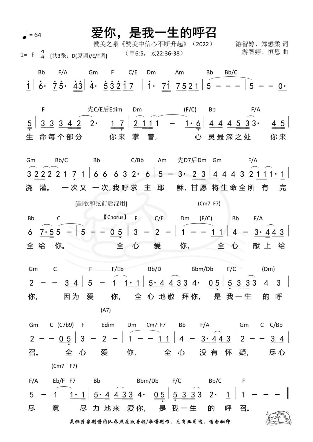 爱你,是我一生的呼召 I Live My Life To Love You 词:游智婷 Sandy Yu、郑懋柔 Tiffany M. Cheng 曲:游智婷 Sandy Yu、恒恩 Brook Heng-En © 2022 Stream of Praise Music / BMI. CCLI 7197680 中文: [Verse] 生命每个部分 你来掌管 心灵最深之处 你来浇灌 ㄧ次又一次 我呼求主耶稣 甘愿将生命全所有 完全给你 [Chorus] 全心爱你 全心献上给你 因为爱你 全心的敬拜你 是我一生的呼召 全心爱你 全心没有怀疑 尽心尽意 尽力地来爱你 是我一生的呼召