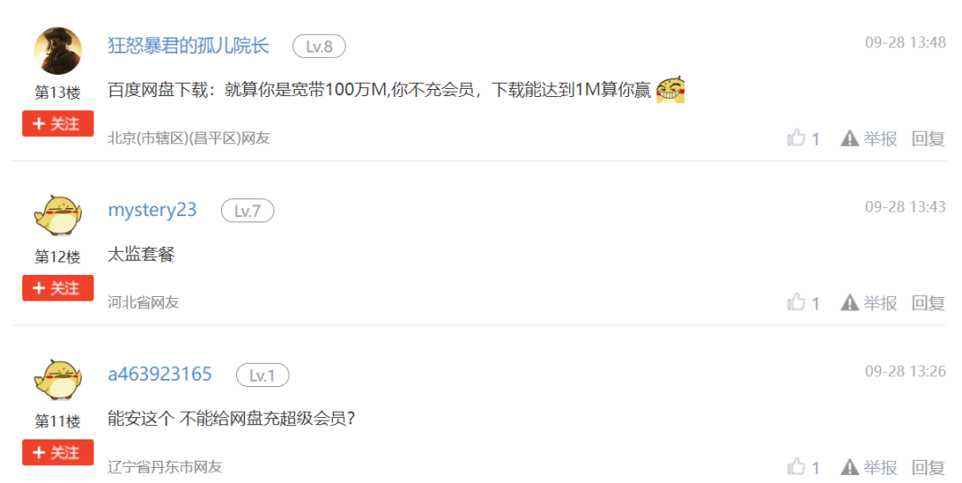 对此,还有网友调侃称,“百度网盘下载,就算你是宽带100万M,不充会员,下载能达到1M算你赢。”
