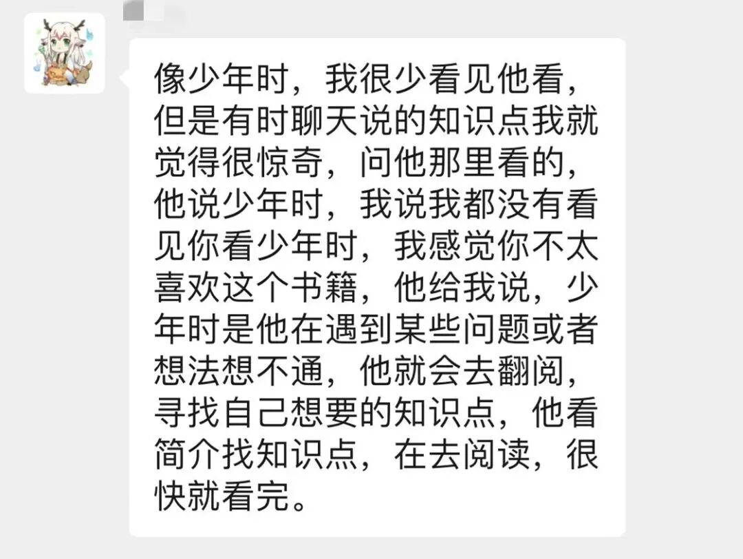 从1小时读10来本书,到忽然抱着1本《少年时》看半天,不吃饭、不睡觉、不玩都要看。