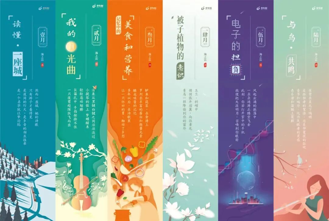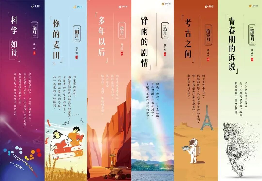 每一本《少年时》寄到手里,翻开就能发现一个精美的、与主题配套的小书签,由海上云作诗、志愿者朗诵,全年12个书签的量,让孩子在阅读科普知识的同时,也能拥有诗意的遐思。