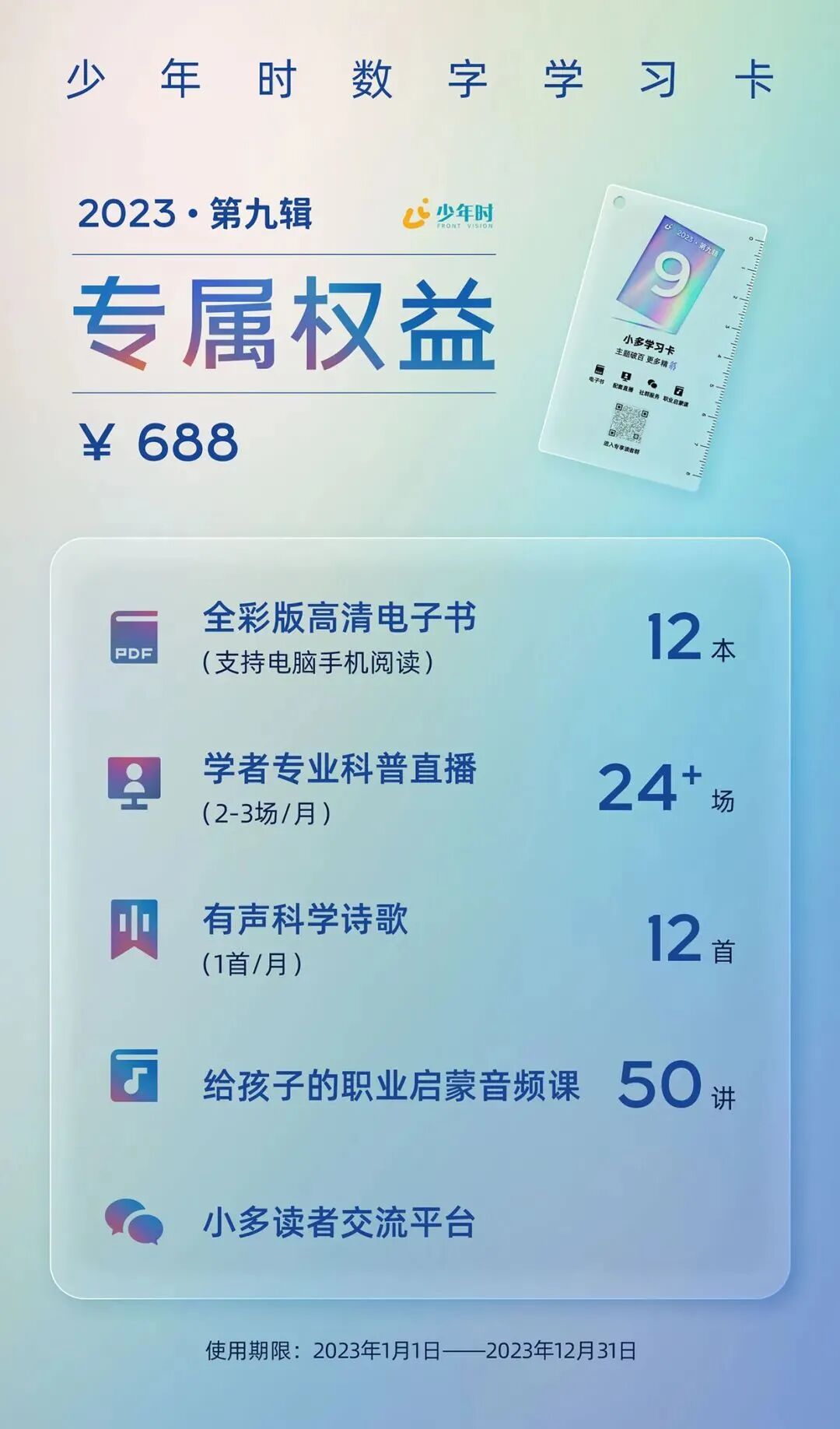 现在下单第九辑《少年时》,送价值688元第九辑学习卡,2023年随第一本少年时邮寄到家,并正式开通线上权益。
