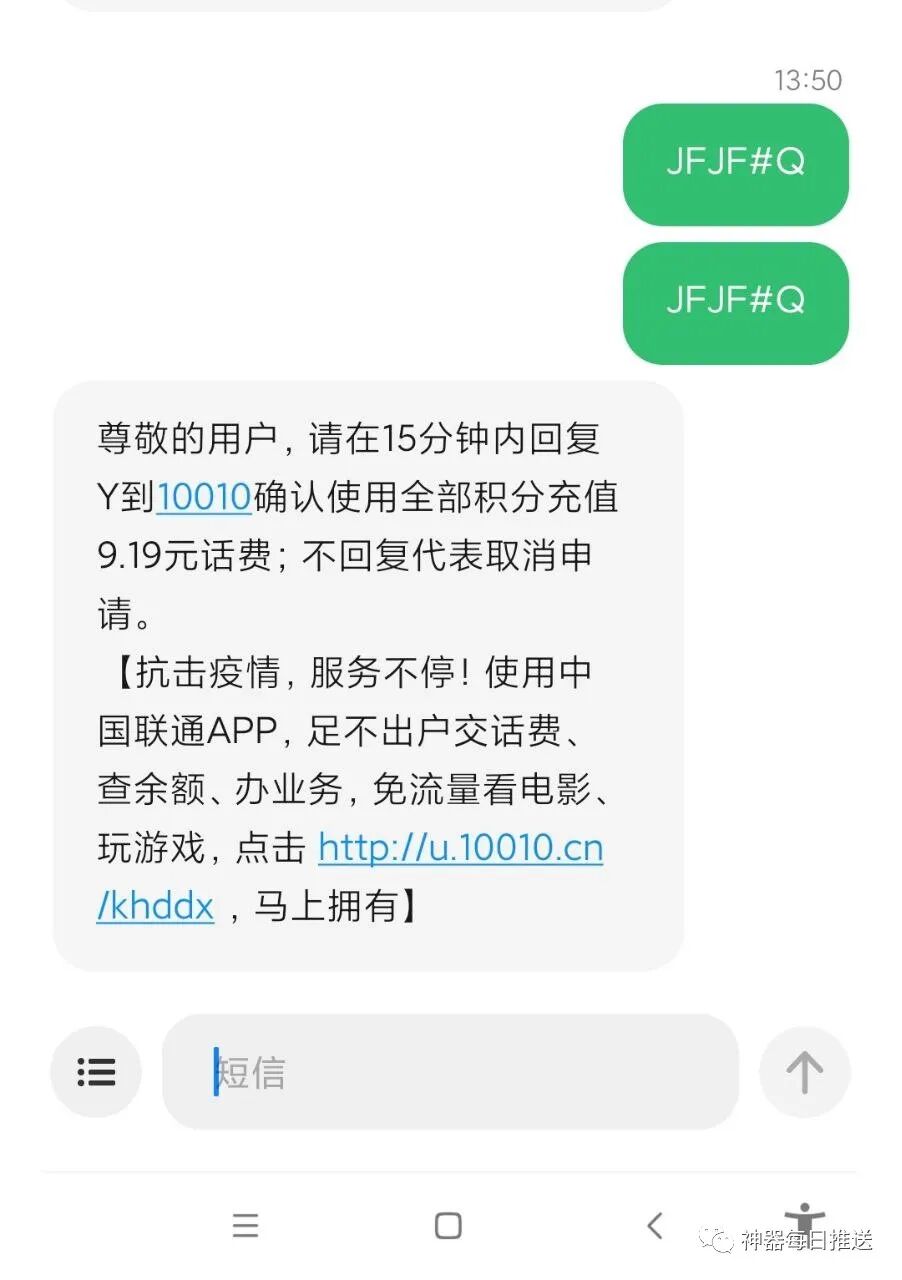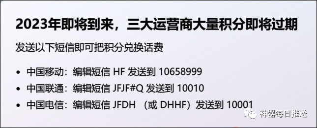 +- 首页 每日神器 正文 年底了,移动、联通、电信又要对用户的积分进行清零了,目前是可以兑换话费的,不兑换就浪费了,实操了一下,我的一个联通号兑换了19.29元,蚊子肉也是肉,也不枉折腾一番。 具体方法如下: 2023年即将到来,三大运营商大量积分即将过期发送以下短信即可把积分兑换话费* 中国移动:编辑短信 HF 发送到10658999* 中国联通:编辑短信 JFJF#Q 发送到10010* 中国电信:编辑短信 JFDH (或DHHF)发送到 10001 以下是兑换截图 热门抖音每日神器 每日神器 收藏 分享 链接