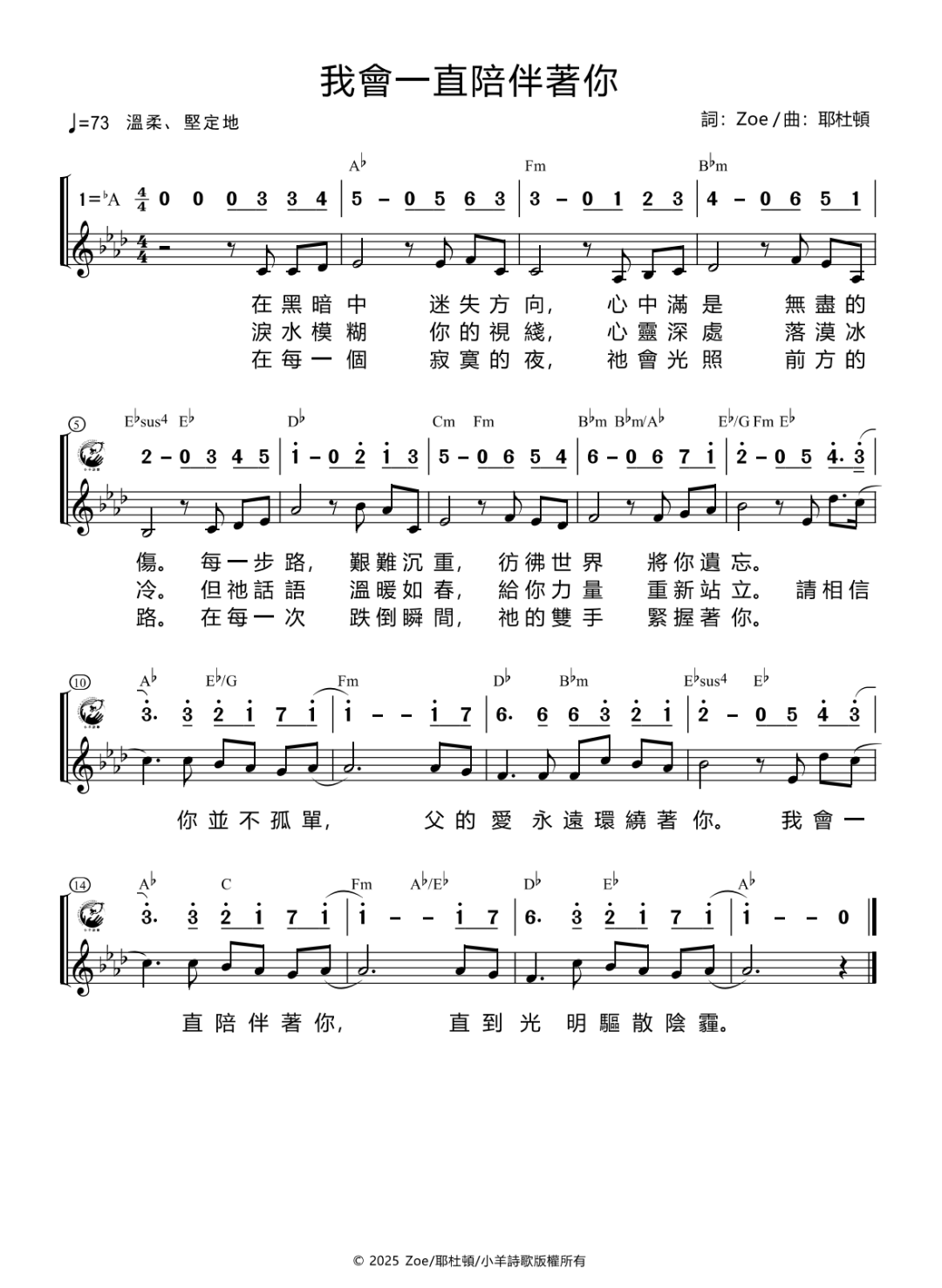 +- 首页 小羊诗歌 正文 音频播放地址: 视频播放地址: 词:亚如 / 曲:耶杜顿、林婉容 / 主唱: 林婉容 【主歌 1】 在黑暗中迷失方向 心中满是无尽的伤 每一步路艰难沉重 彷彿世界将你遗忘 【副歌】 请相信你并不孤单 父的爱永远环绕著你 我会一直陪伴著你 直到光明驱散阴霾 【主歌 2】 泪水模糊你的视綫 心灵深处落漠冰冷 但他话语温暖如春 给你力量重新站立 【主歌 3】 在每一个寂寞的夜 他会光照前方的路 在每一次跌倒瞬间 他的双手紧握著你 歌谱: 赞美诗歌未整理以斯拉盛晓玫祝瑞莲生命河灵粮堂小羊诗歌Jesus Image天韵合唱团新酒使命团我心旋律JLSS BlessedThe Hope佳音 收藏 分享 链接