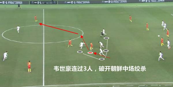 对战朝鲜队的最后一场比赛中,朝鲜人通过非常强势地队形前压牢牢控制住了中场。从上图中就可以看到,朝鲜队在国足中圈之前的位置一共有8名球员,他们在中场投入4人反抢绞杀,中国男足就因为屡屡在中场位置失误和被断球,而遭遇对手压制。这次的反击中,韦世豪完成1过3的精彩破局,为张文钊送出妙传,几乎将比分扩大到2-0。可以说本场比赛里再度完成进球的韦世豪,又一次惊艳了中国球迷。相信对于这名眼下只有22岁的攻击手来说,今后如果能得到足够多的中超出场机会的话,他绝对有希望成长为国足未来的锋线支柱球员。在与日本、韩国和朝鲜队的交锋时,韦世豪是球队少有一对一能够占据单兵优势的球员,这一点让人非常欣喜。