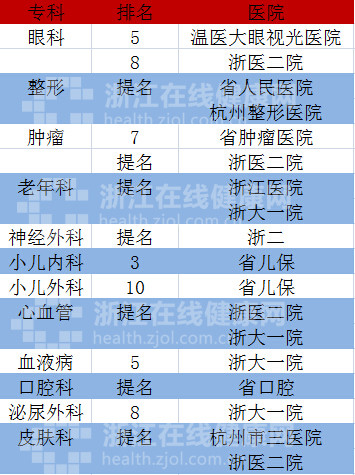 除了这些进入专科百强榜单的医院,省人民、杭州整形、浙江医院、省口腔、杭州市三医院都有相关专科进入专科前十或被提名。