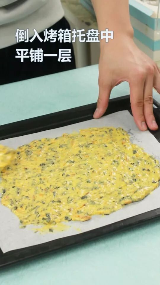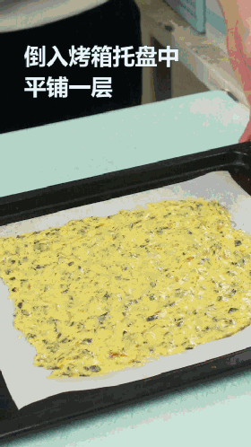 将搅拌均匀地面糊倒入烤盘中,平铺一层;