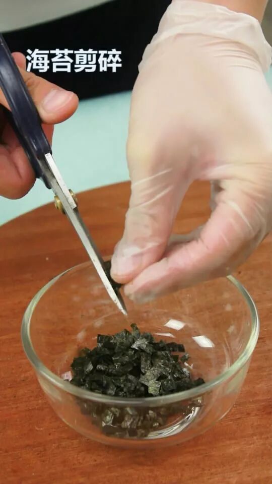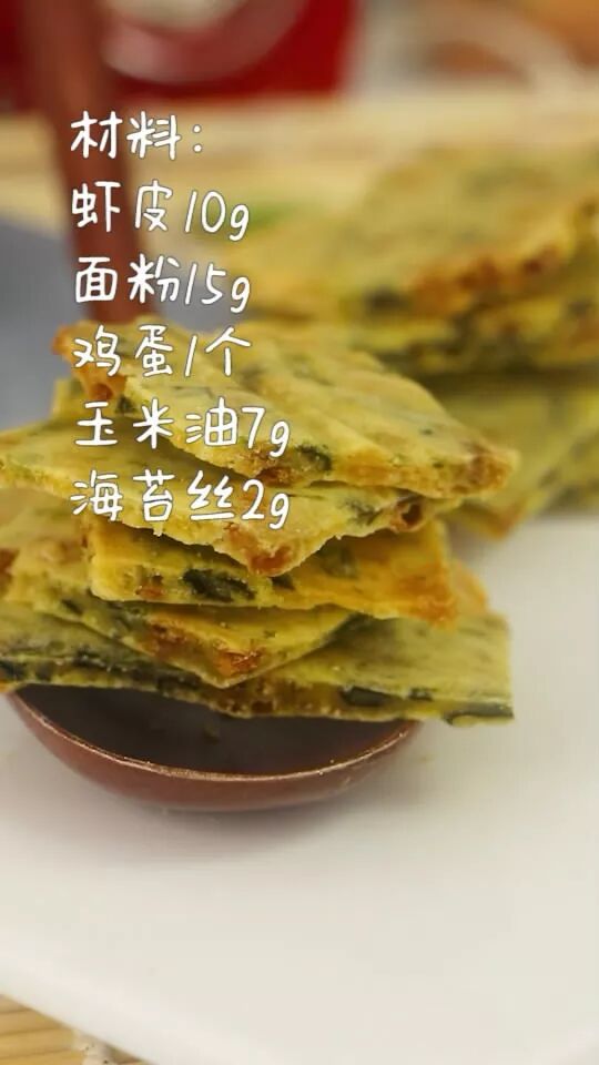 用料:虾皮10g、面粉15g、鸡蛋1个、玉米油7g、海苔丝2g
