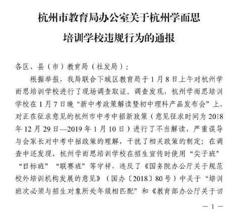 今天下午,杭州市教育局下发关于杭州学而思培训学校违规行为的通报。