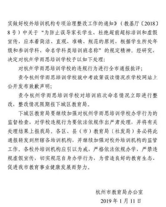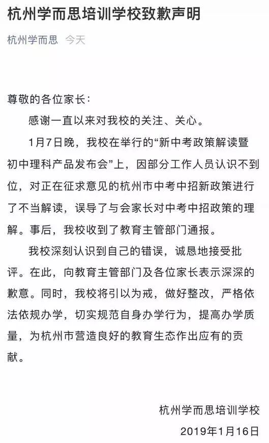 杭州市教育局责令,杭州学而思培训学校就中考政策误读情况,在学校网站上公开发布致歉声明;对培训班次明明情况立即进行整改。