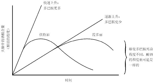 图中曲线的斜率表示大脑中某种化学物质(在上述情况下是指酒精)含量的上升速度。上升越快,释放的多巴胺越多,表明越兴奋,产生的渴望越多。